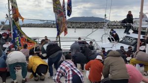 お祝いに来た人たちを乗せて島の港の外を一回りした後は、なんとも盛大な餅まきでした。