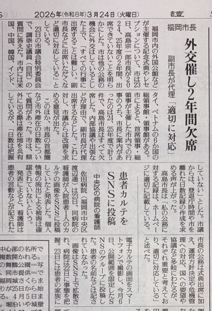 日本国内に外国の領事館等は55館ありますが、東京23区も含めて20の自治体にしか置かれていません。福岡市の市長にとって、外交は日常の仕事の一部、市民の皆さまから頂戴する給料のうちであり、特に市民を代表して出席を求められる行事への参加は、市長にしかできない優先順位の高い仕事です。令和8年度以降、どのような改善が見られるか注視したいと思います。